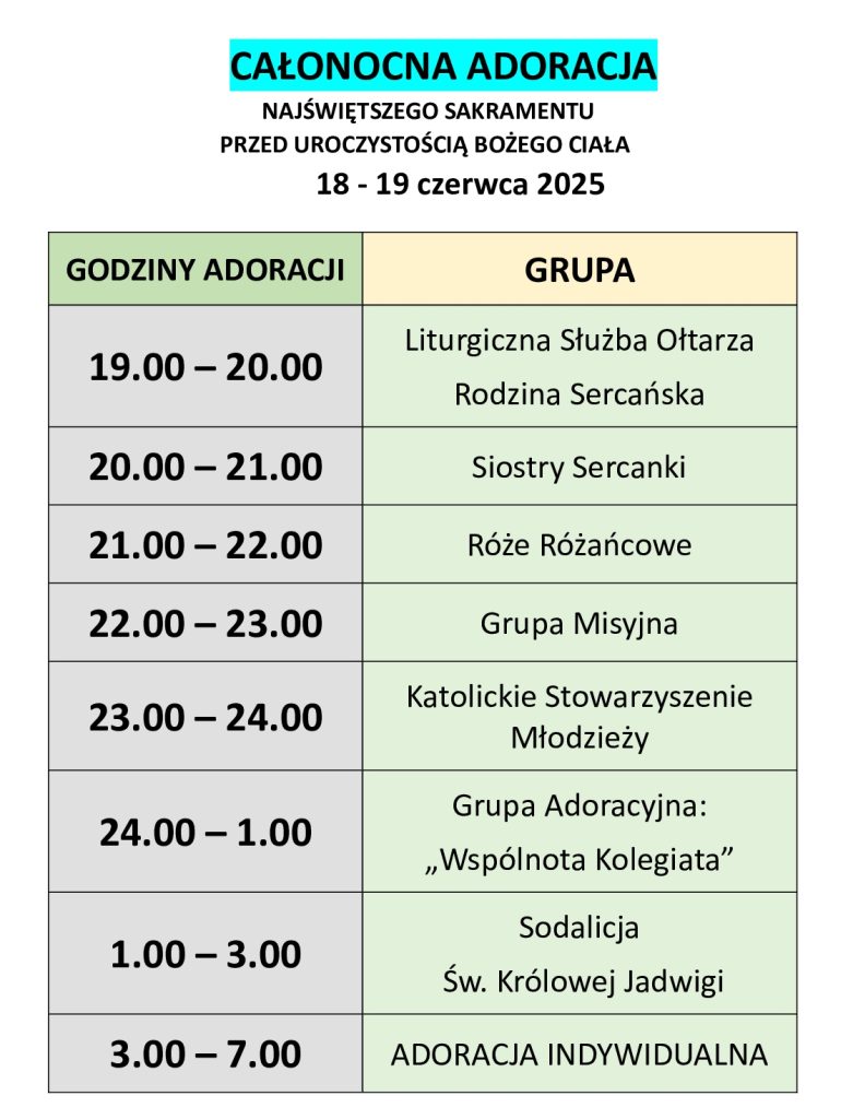 W środę – 18 czerwca br. – przed Uroczystością Bożego Ciała w naszym kościele odbędzie się całonocna adoracja Najświętszego Sakramentu, która rozpocznie się po Mszy wieczornej i będzie trwać do godz. 7.00. Zapraszamy wszystkich Parafian do nocnego czuwania i uwielbienia Jezusa w Najświętszym Sakramencie, a szczególnie osoby zaangażowane w grupy duszpasterskie, aby uczestniczyły w modlitwie według poniższego harmonogramu: