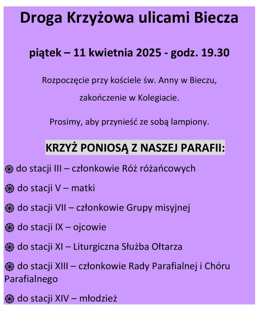 W piątek – 11 kwietnia br. – o godz. 19.30 zachęcamy do wzięcia udziału w Drodze Krzyżowej ulicami BIECZA, która wyruszy z placu przy Klasztorze Ojców Franciszkanów do Kolegiaty. Dlatego też w naszym kościele nie będzie nabożeństwa Drogi Krzyżowej o godz. 19.00. Zachęcamy do udziału w nabożeństwie i prosimy o zabranie ze sobą lampionów.