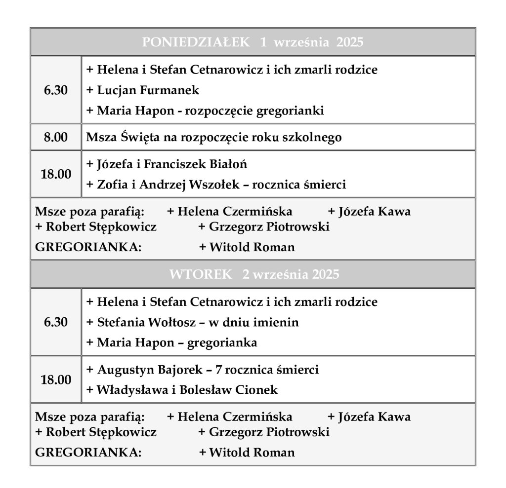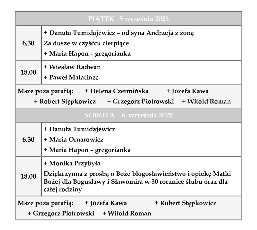 INTENCJE MSZALNE 1 – 7 września 2025 r.
