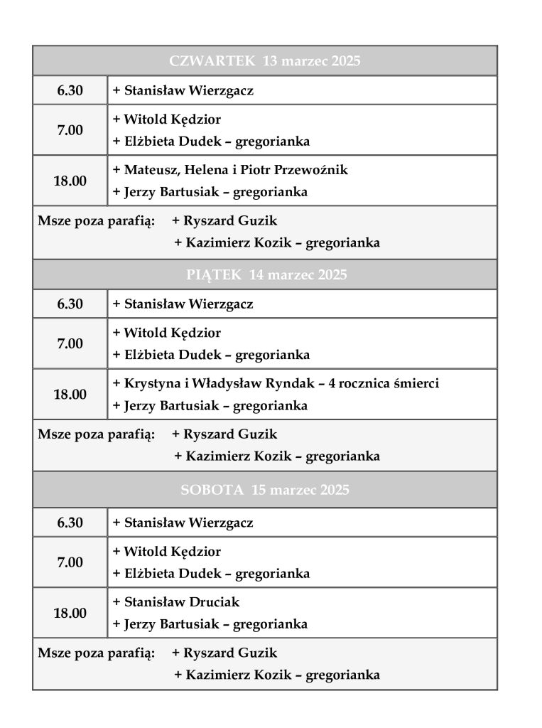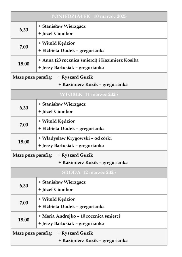 INTENCJE MSZALNE 10 – 16 marzec 2025 r.