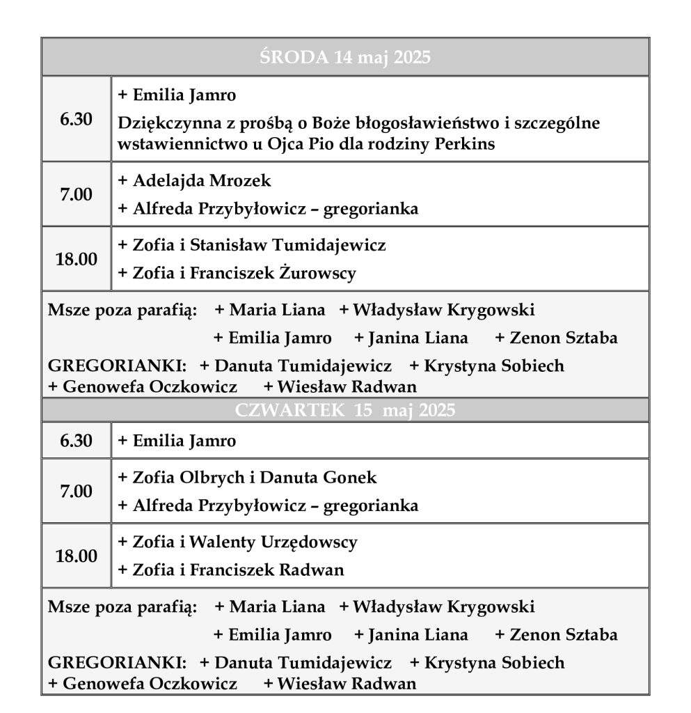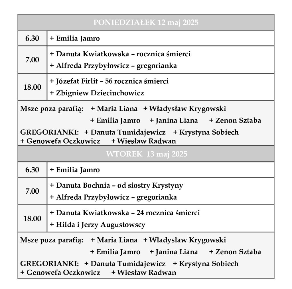 INTENCJE MSZALNE 12 – 18 maja 2025 r.