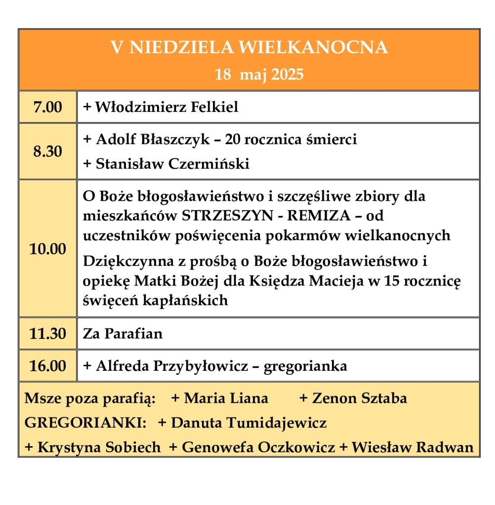 Ogłoszenia parafialne – 5. Niedziela Wielkanocna – 18.05.2025 r.