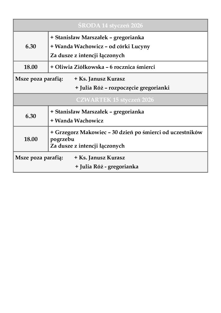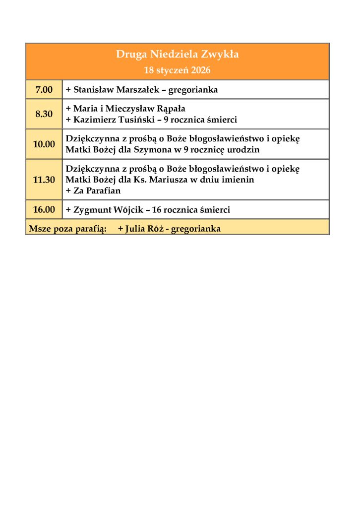 INTENCJE MSZALNE 12-18 styczeń 2026 r.