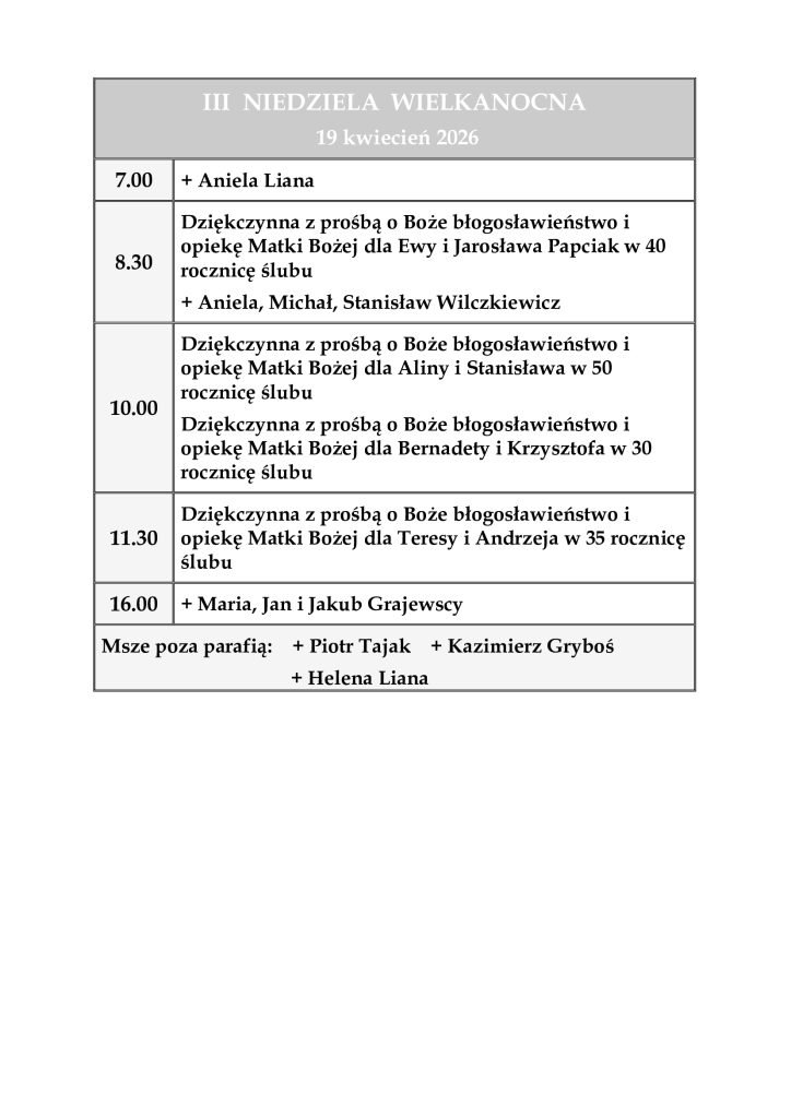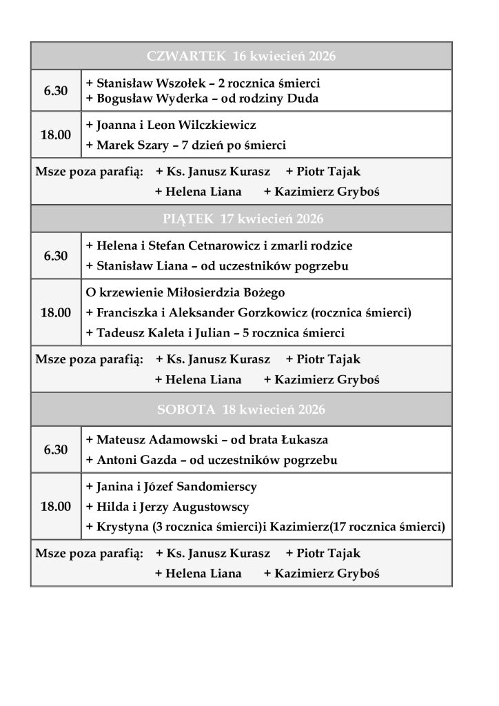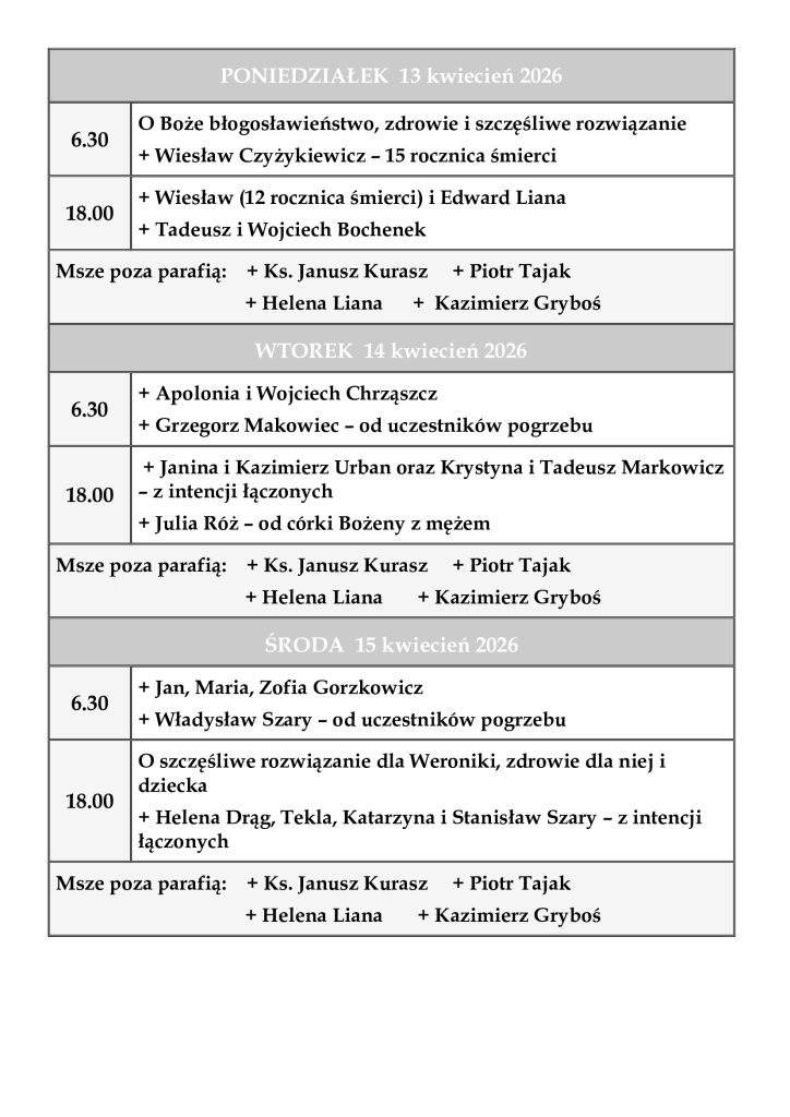 INTENCJE MSZALNE 13-19 kwiecień 2026 r.