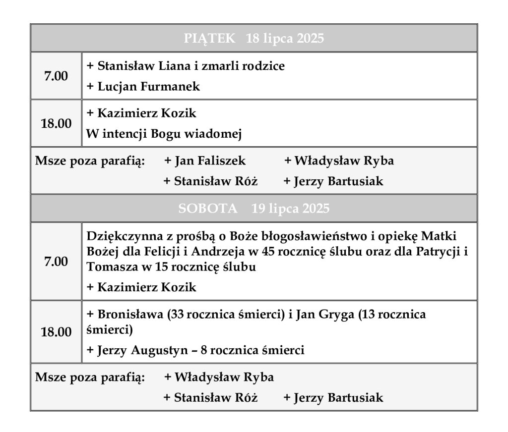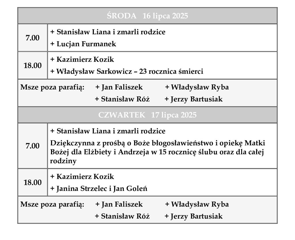 INTENCJE MSZALNE 14 – 20 lipca 2025 r.