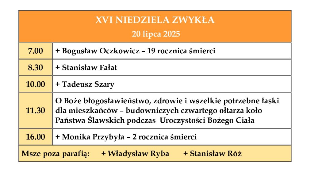 Ogłoszenia parafialne – XVI Niedziela Zwykła – 20.07.2025 r.