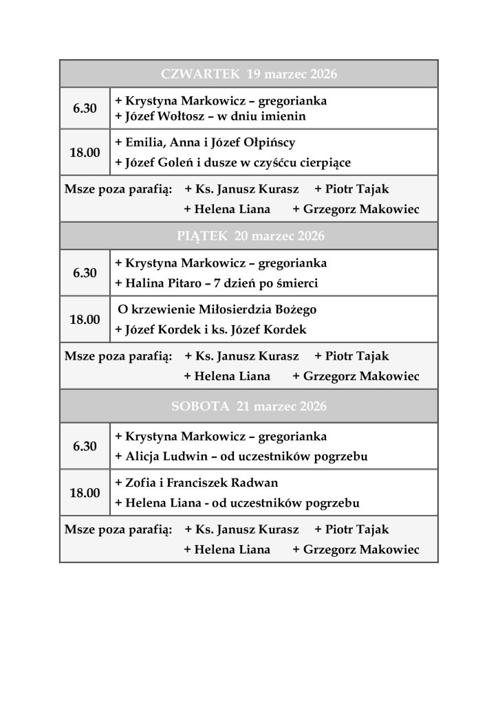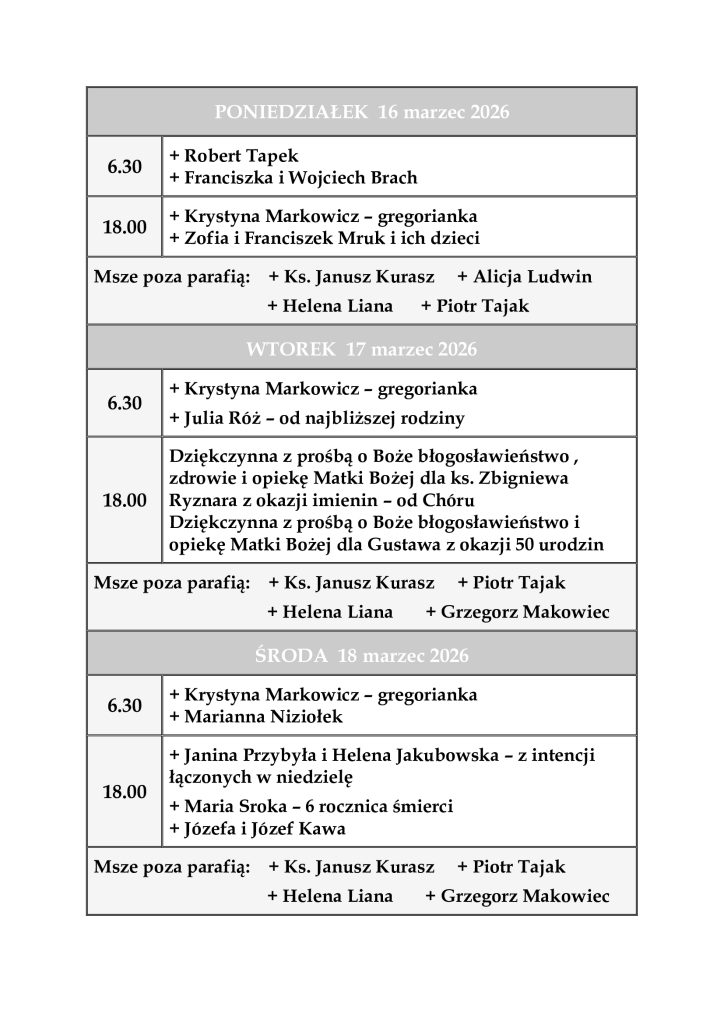 INTENCJE MSZALNE 16-22 marzec 2026 r.
