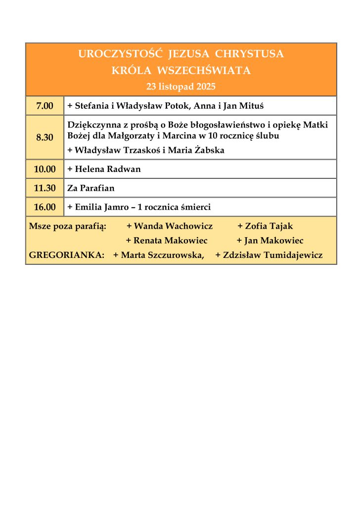 OGŁOSZENIE DUSZPASTERSKIE NIEDZIELA CHRYSTUSA KRÓLA 23.11.2025