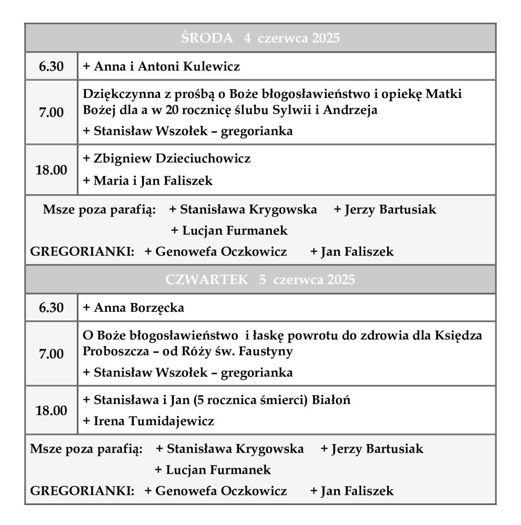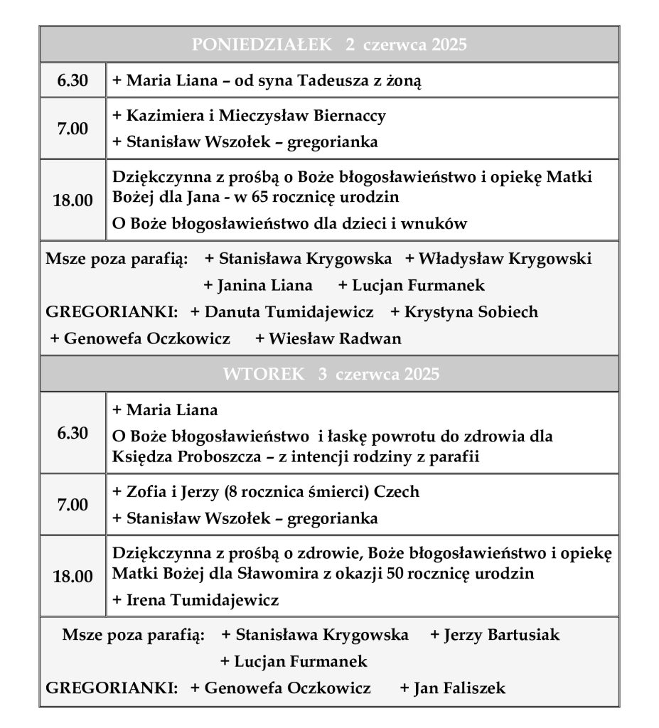 INTENCJE MSZALNE 2 – 8 czerwca 2025 r.