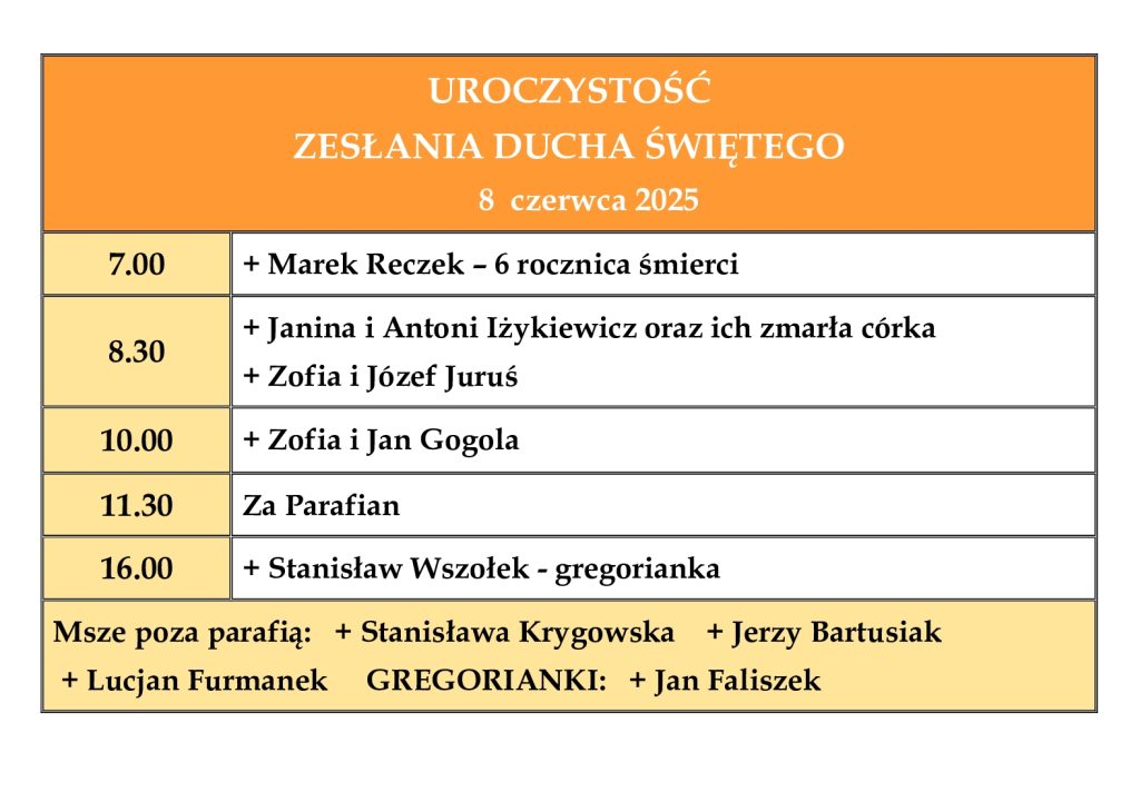 Ogłoszenia parafialne – Uroczystość Zesłania Ducha Świętego – 8.06.2025 r.