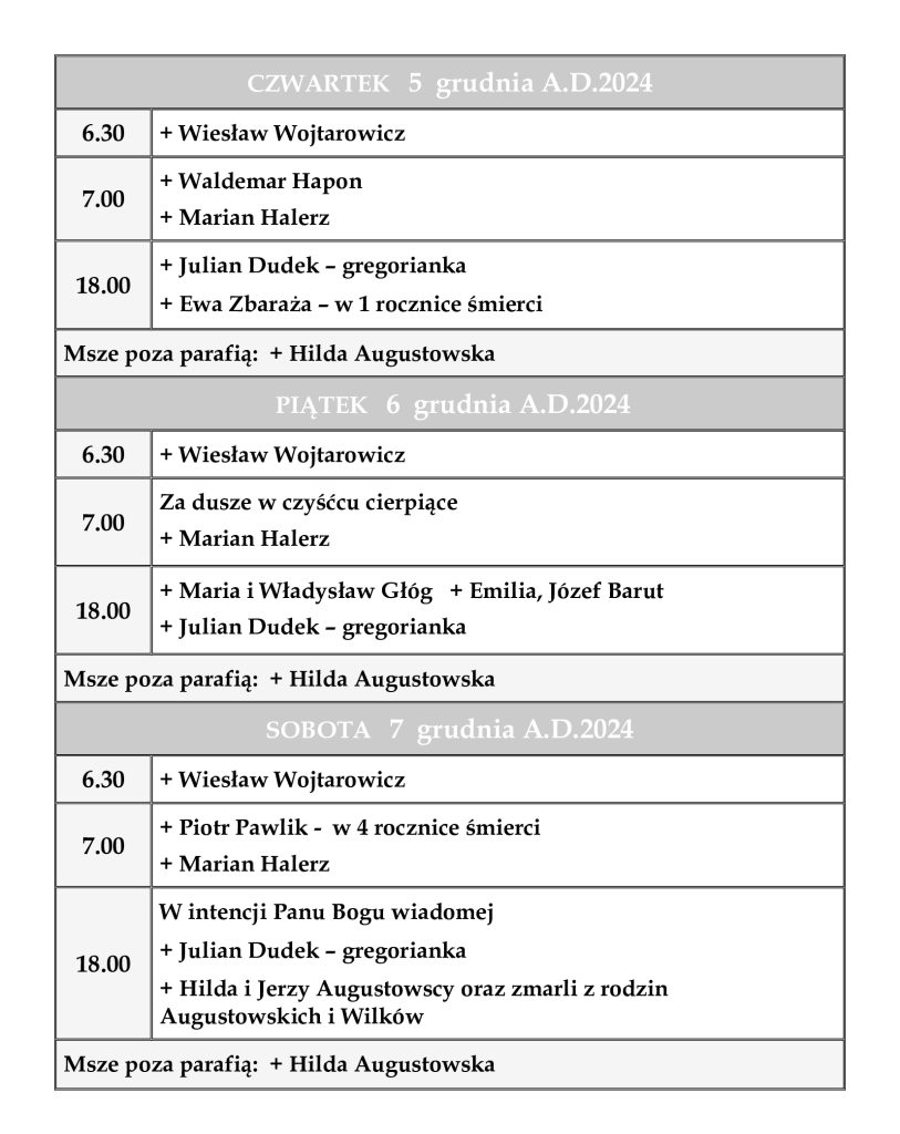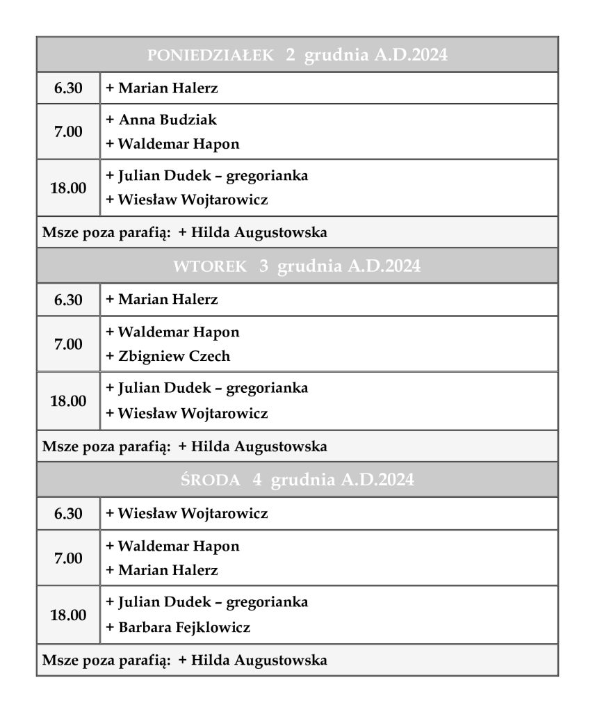 INTENCJE MSZALNE 2 – 8 grudnia 2024 r.