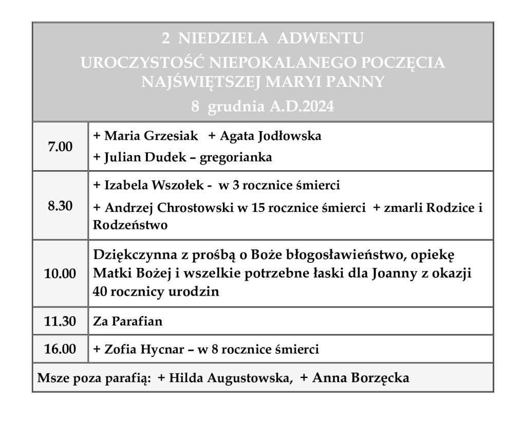 Ogłoszenia parafialne – 2. Niedziela Adwentu – Uroczystość Niepokalanego Poczęcia Najświętszej Maryi Panny – 08.12.2024 r