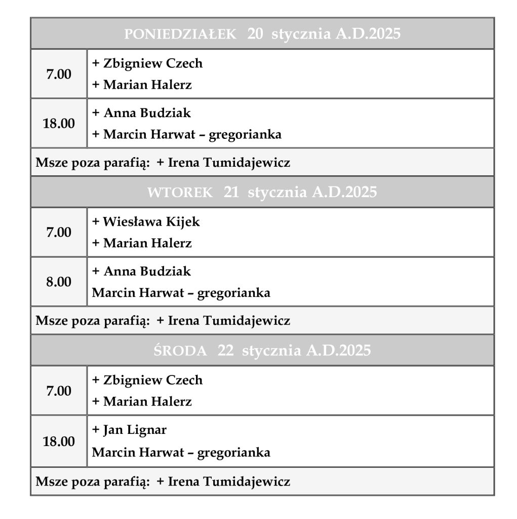 INTENCJE MSZALNE 20 – 26 stycznia 2025 r.