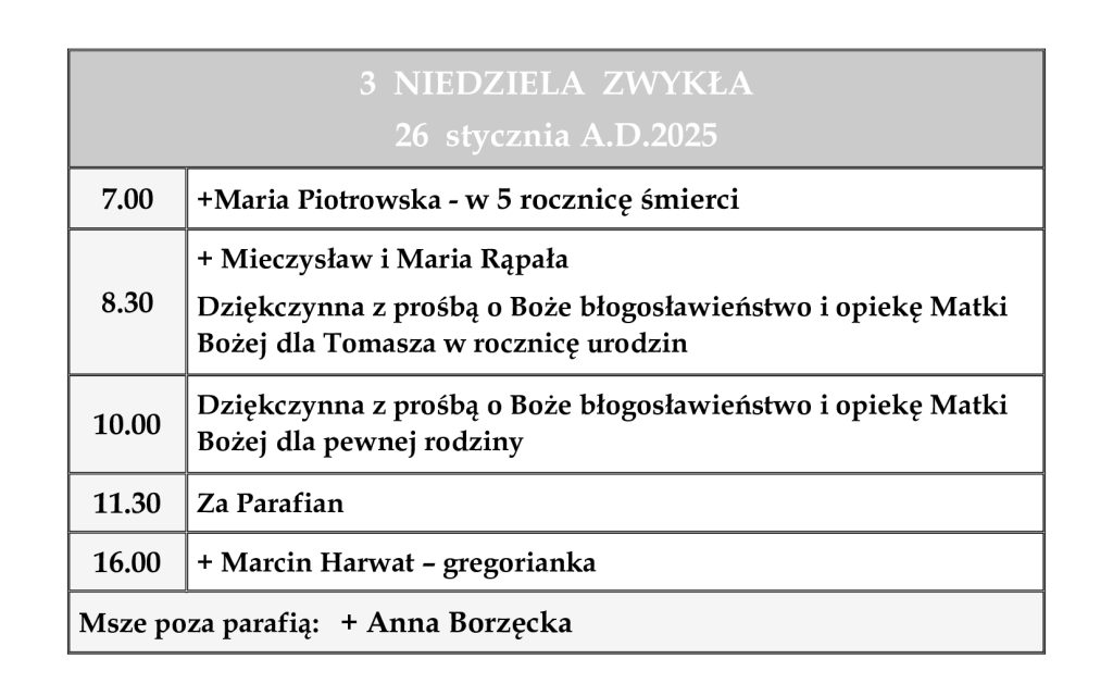 Ogłoszenia parafialne – 3. Niedziela Zwykła – Niedziela Słowa Bożego – 26.01.2025 r.