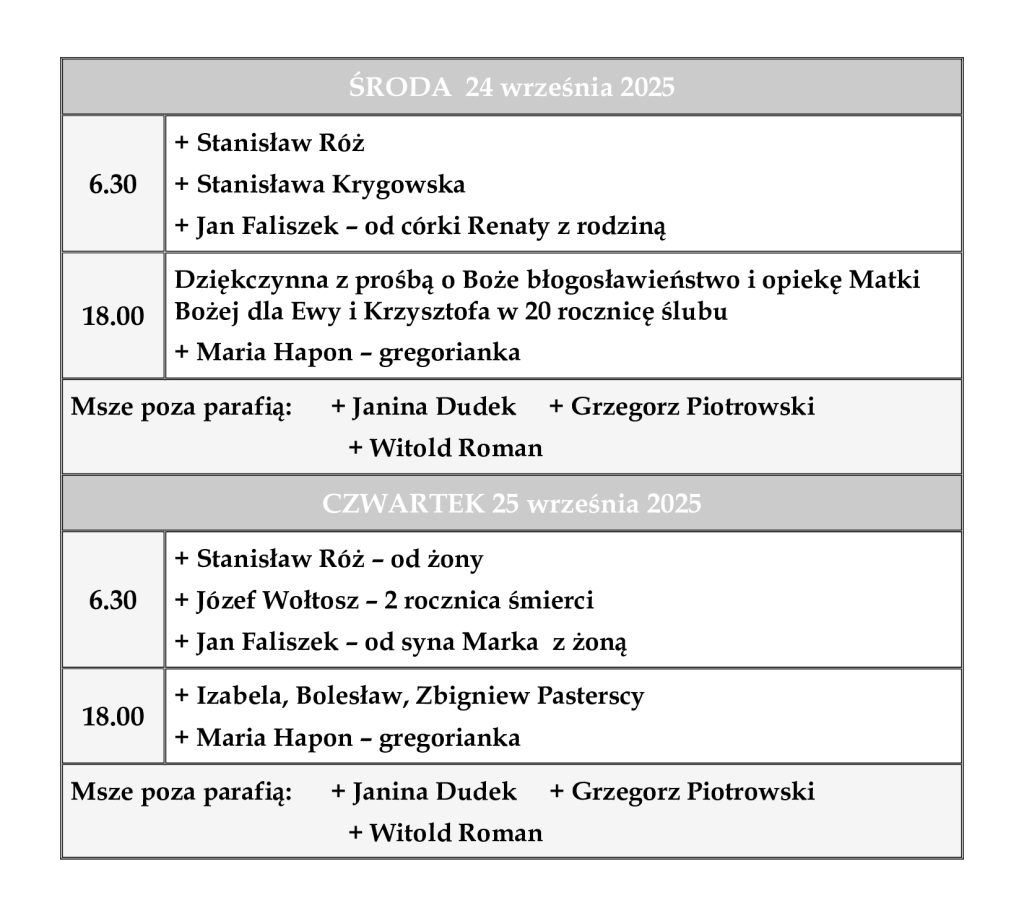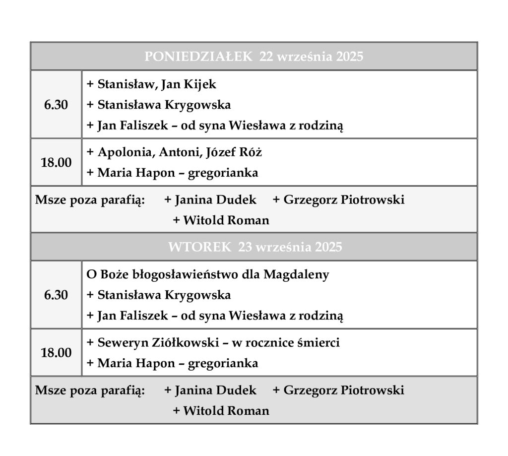 INTENCJE MSZALNE 22 – 28 września 2025 r.