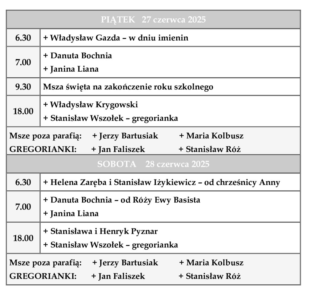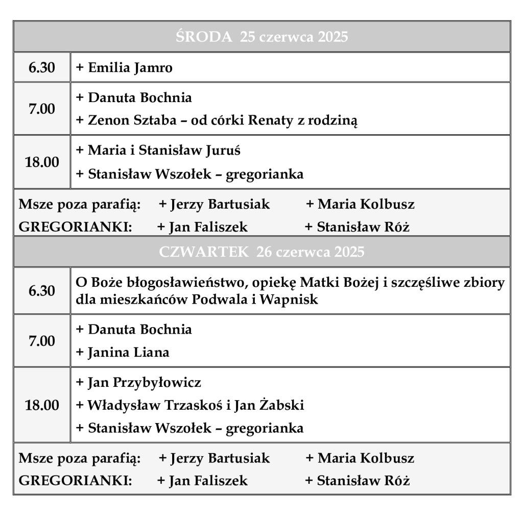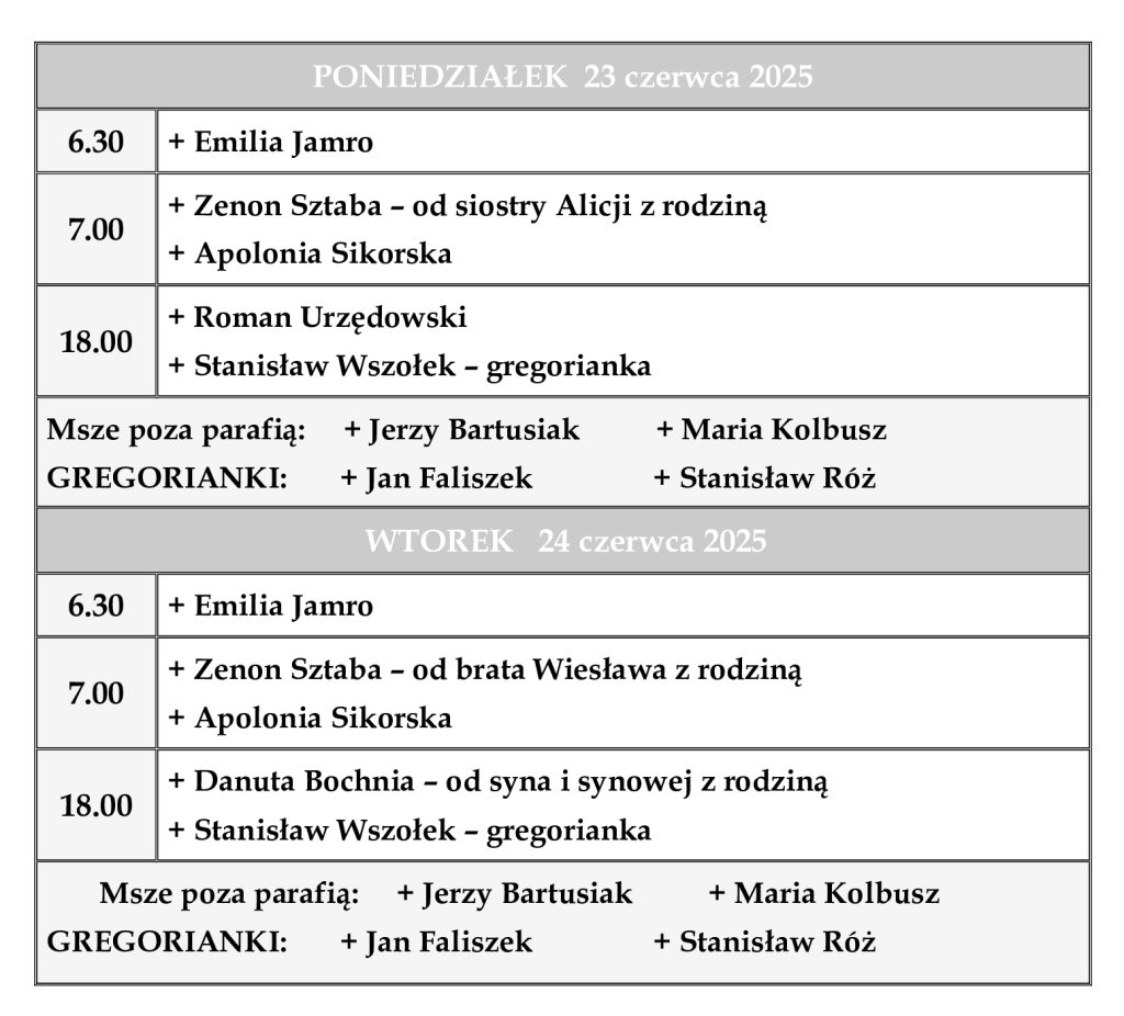 INTENCJE MSZALNE 23 – 29 czerwca 2025 r.