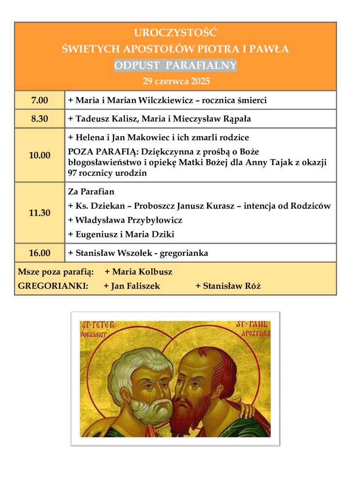Ogłoszenia parafialne – Uroczystość Świętych Apostołów Piotra i Pawła – 29.06.2025 r.