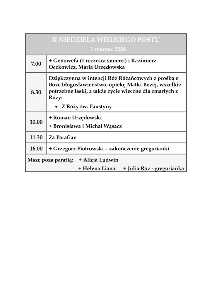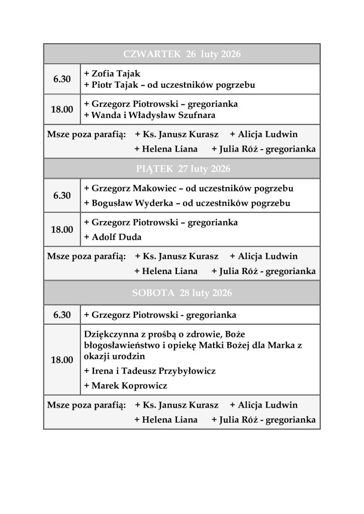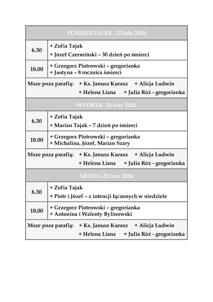 INTENCJE MSZALNE 23 luty – 1 marzec 2026 r.