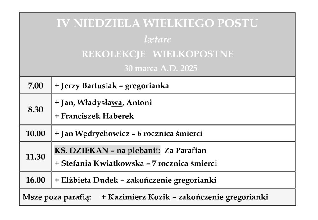 Ogłoszenia parafialne – 4. Niedziela Wielkiego Postu – Niedziela laetare – 30.03.2025 r.