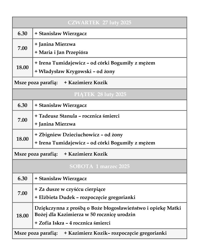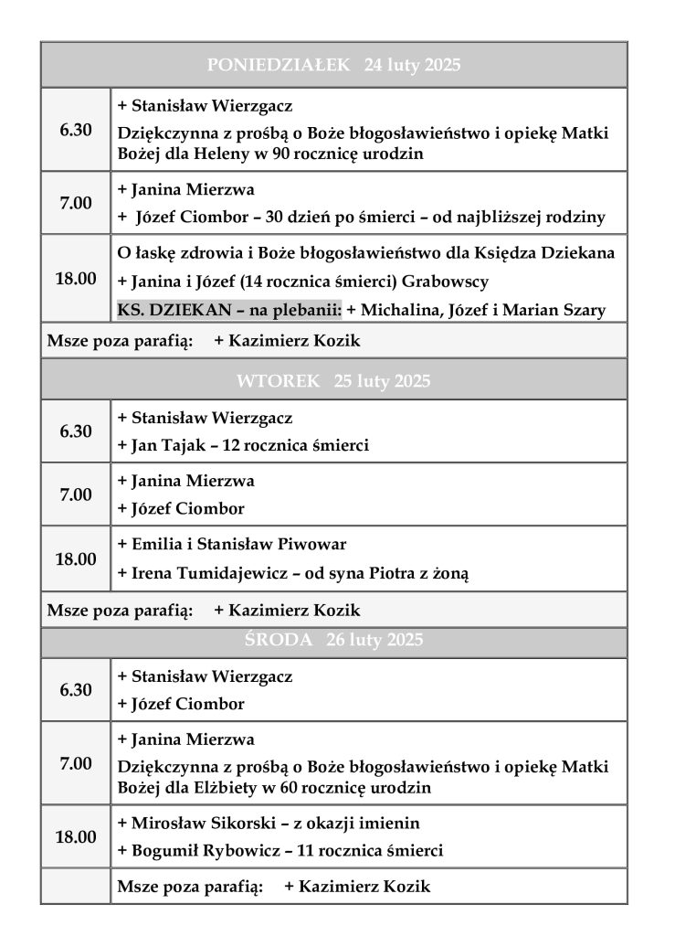 INTENCJE MSZALNE 24 luty – 2 marzec 2025 r.
