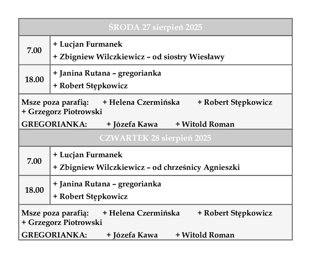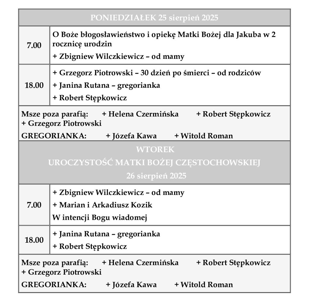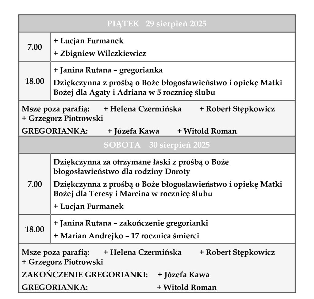 INTENCJE MSZALNE 25 – 31 sierpnia 2025 r.
