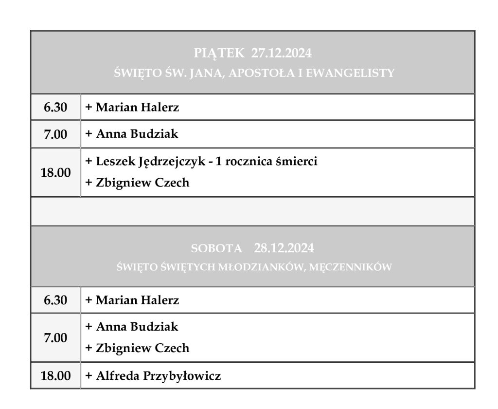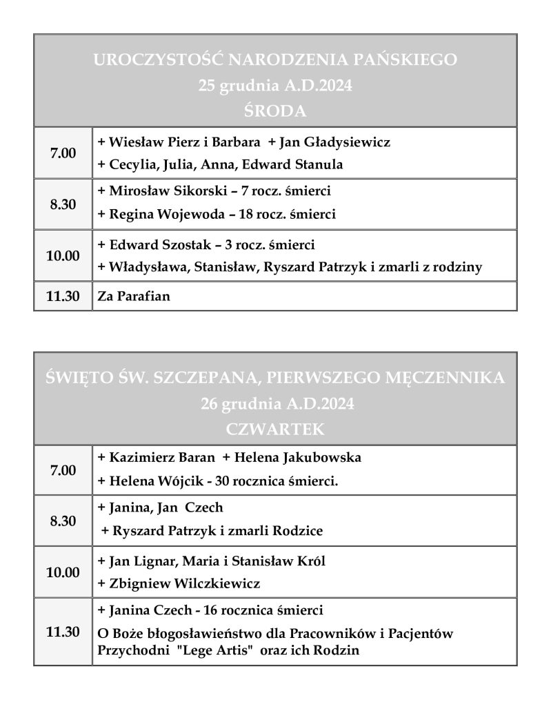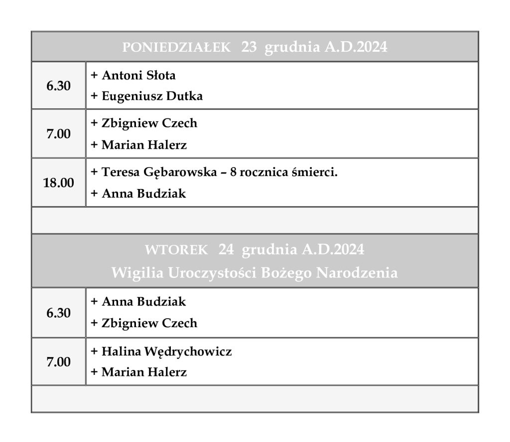 INTENCJE MSZALNE 23– 29 grudnia 2024 r.