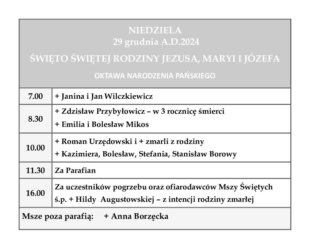 Ogłoszenia parafialne – Święto Świętej Rodziny Jezusa, Maryi i Józefa – 29.12.2024 r.
