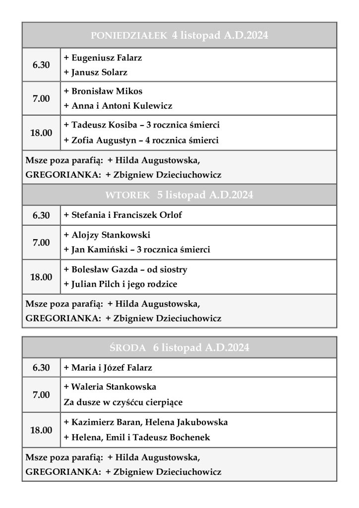 INTENCJE MSZALNE 4 – 10 listopada 2024 r.