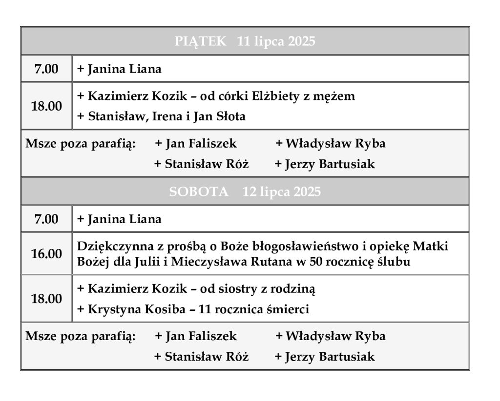 INTENCJE MSZALNE 7 – 13 lipca 2025 r.