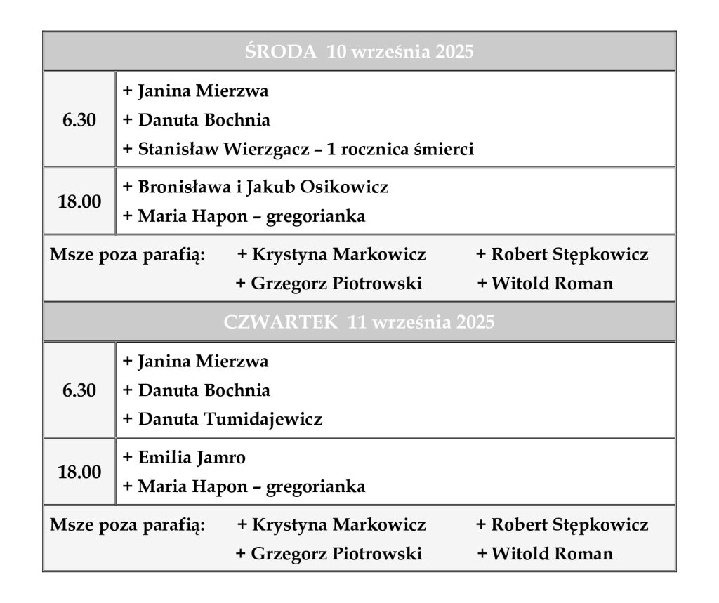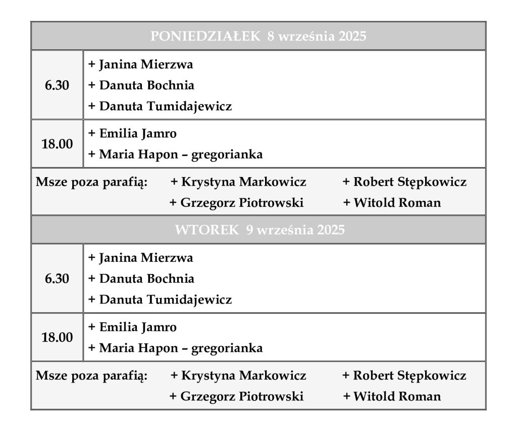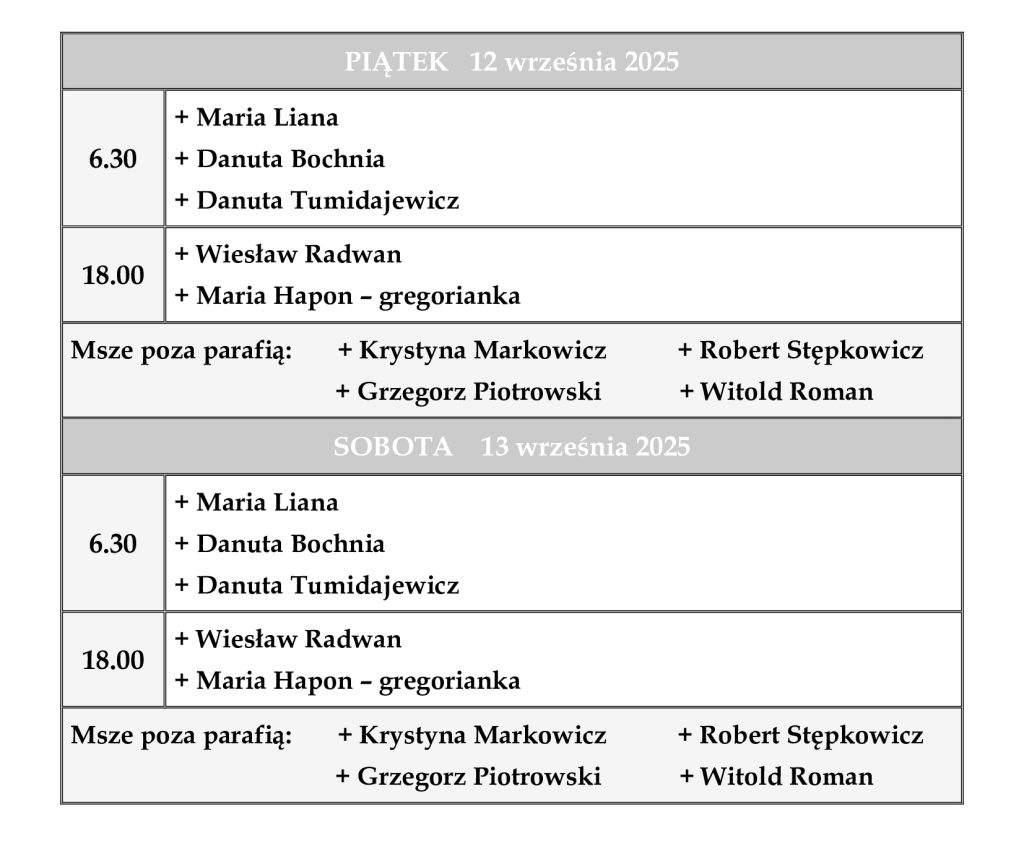 INTENCJE MSZALNE 8 – 14 września 2025 r.