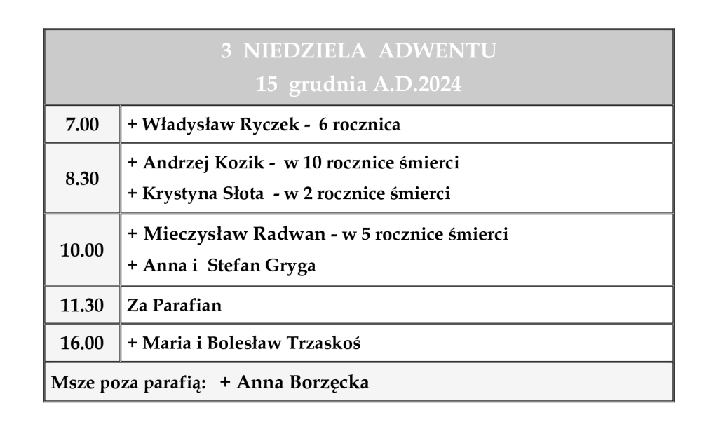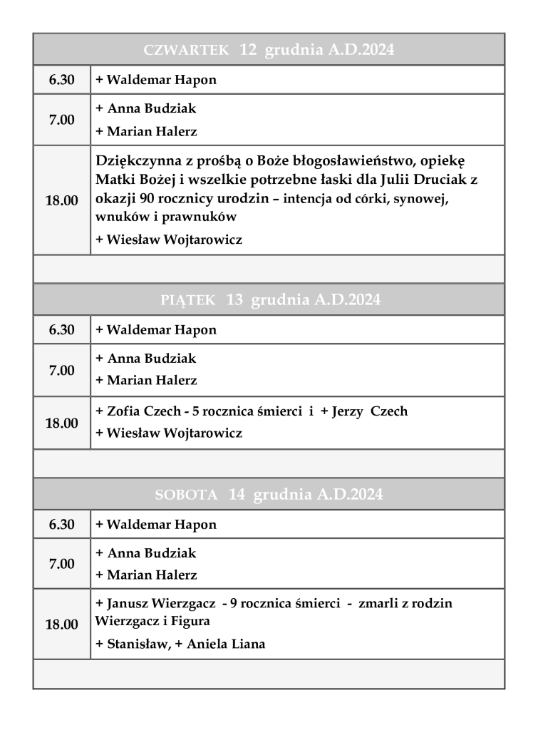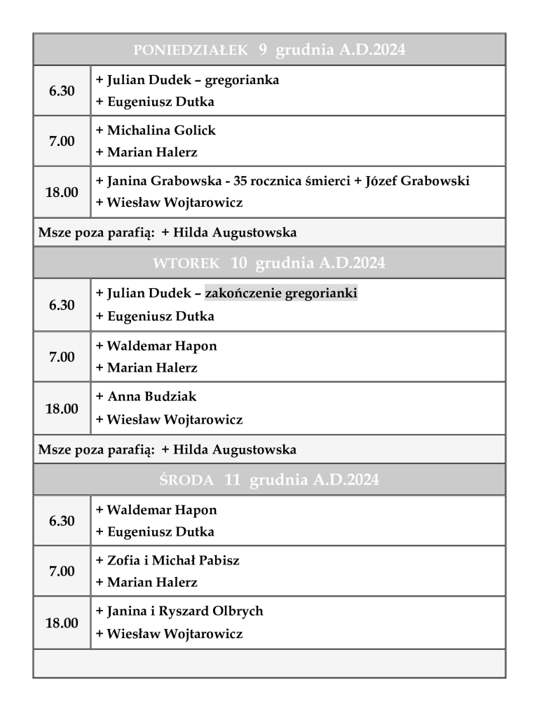 INTENCJE MSZALNE 9 – 15 grudnia 2024 r.