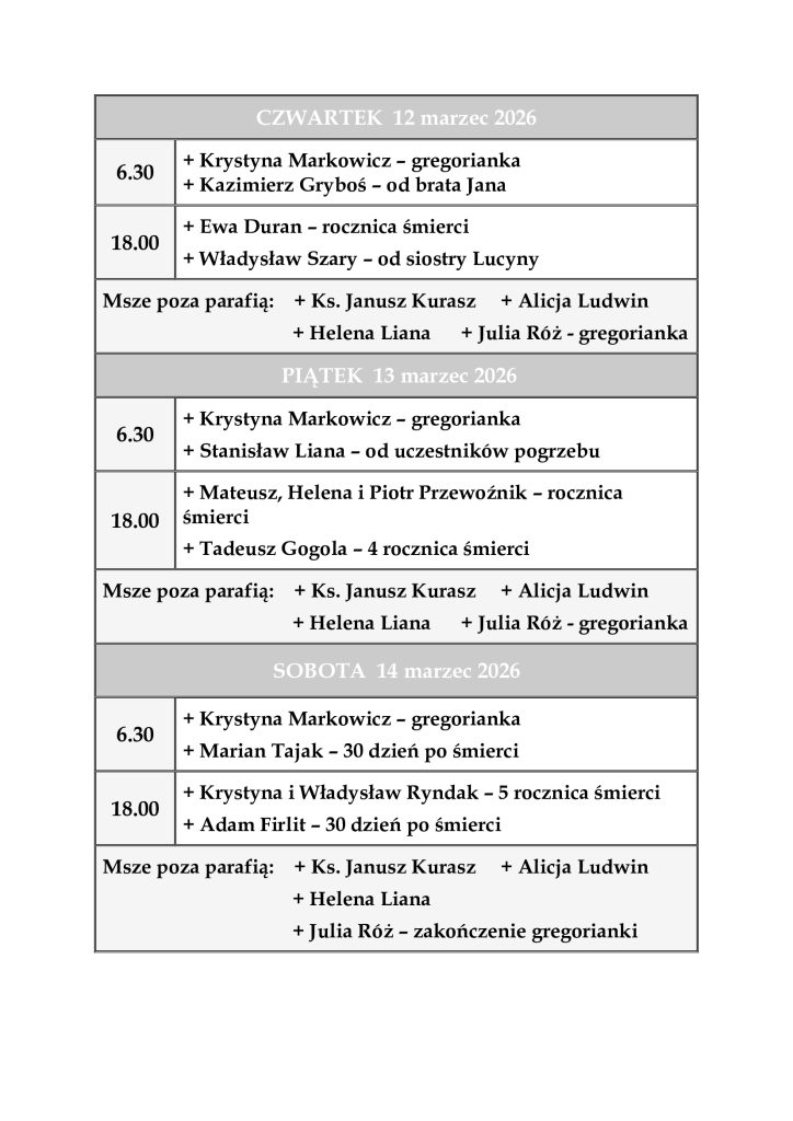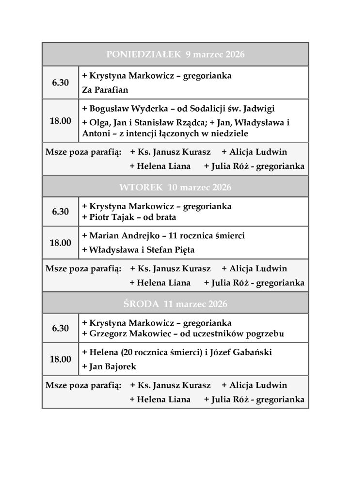 INTENCJE MSZALNE 9 – 15 marzec 2026 r.