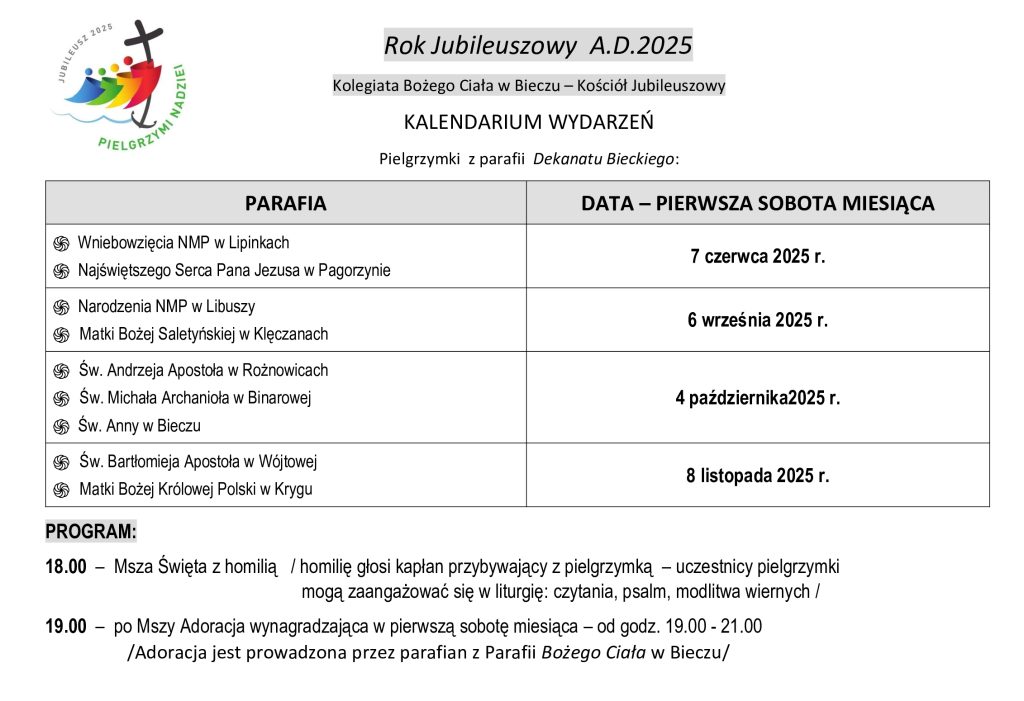W związku z trwającym Rokiem Jubileuszowym, nasz kościół – KOLEGIATA w BIECZU – jako Kościół Stacyjny – będzie miejscem pielgrzymek parafii dekanatu bieckiego. Pielgrzymki odbywać się będą w pierwsze soboty miesiąca. Pielgrzymi wezmą udział we Mszy Świętej o godz. 18.00, podczas której kazania głosić będą księża z poszczególnych parafii. Po Mszy Świętej zapraszamy na nabożeństwo pierwszo-sobotnie, które zakończymy wspólnym Apelem Jasnogórskim. W sobotę – 7 czerwca br. – przybędą do nas pielgrzymi z parafii Najświętszego Serca Pana Jezusa w Pagorzynie oraz Wniebowzięcia NMP w Lipinkach. Harmonogram pielgrzymek poniżej: