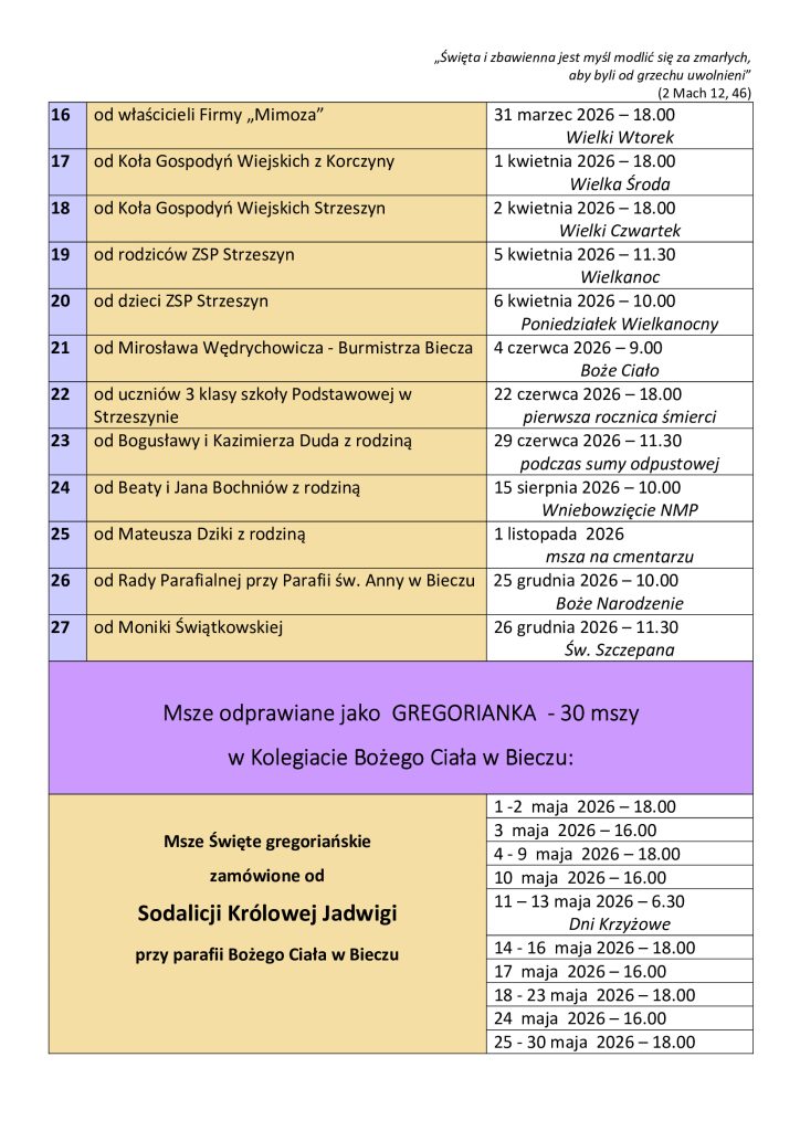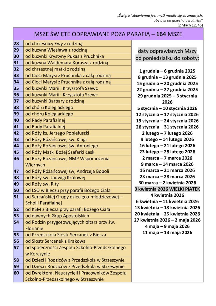INTENCJE MSZALNE 29 września – 5 października 2025 r.